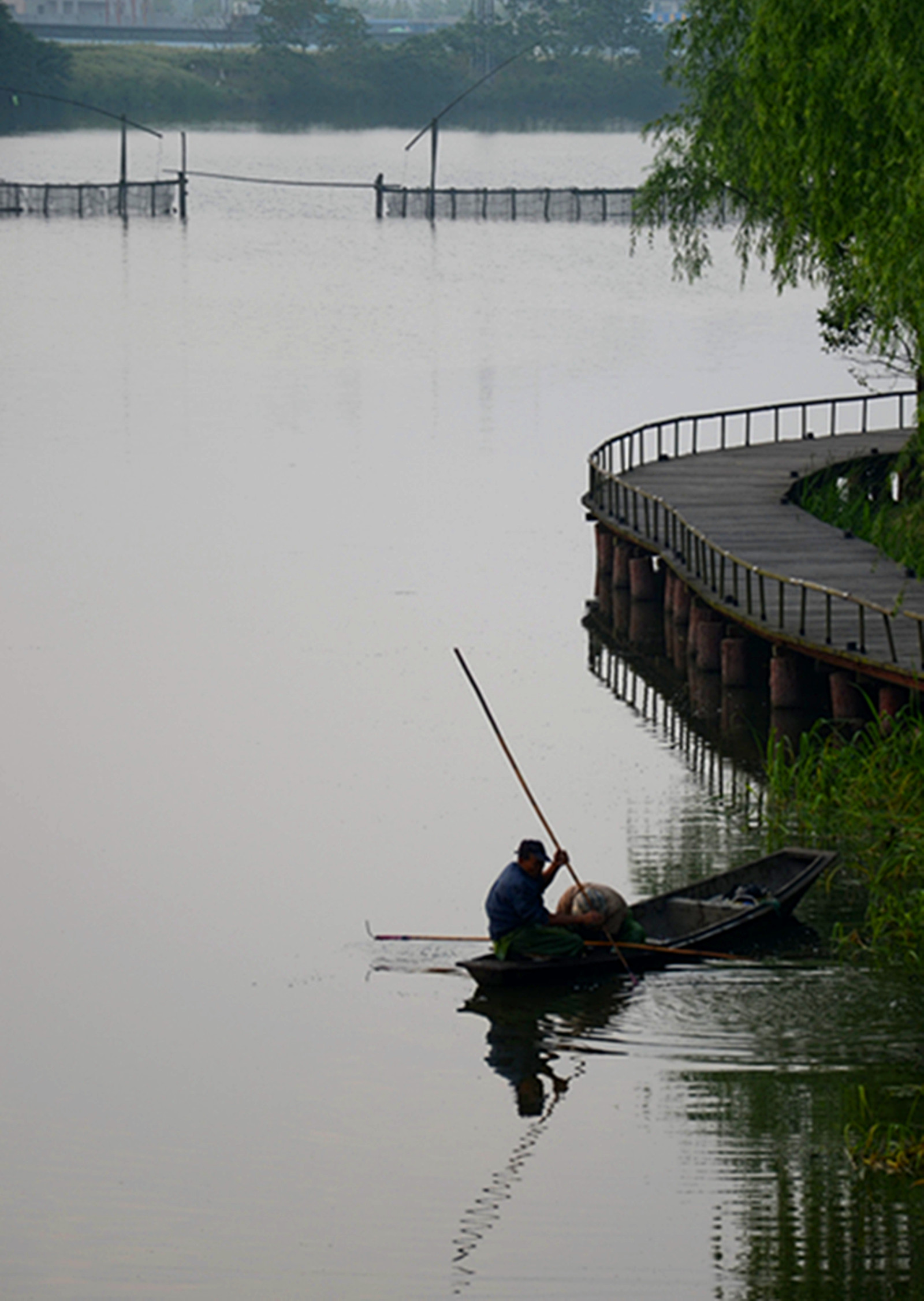清晨小湖中,一老人似在布网打渔,此时此景,多么的自然、悠闲,有如世外桃源一般。