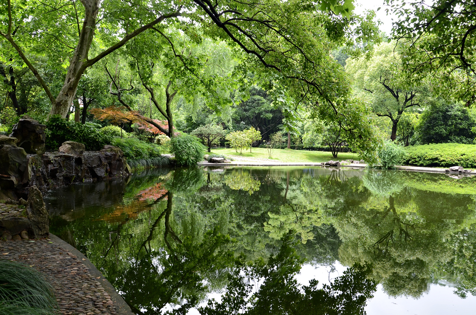 明镜似的湖水倒映的青翠绿树,组成了一幅美丽无比的水彩画。