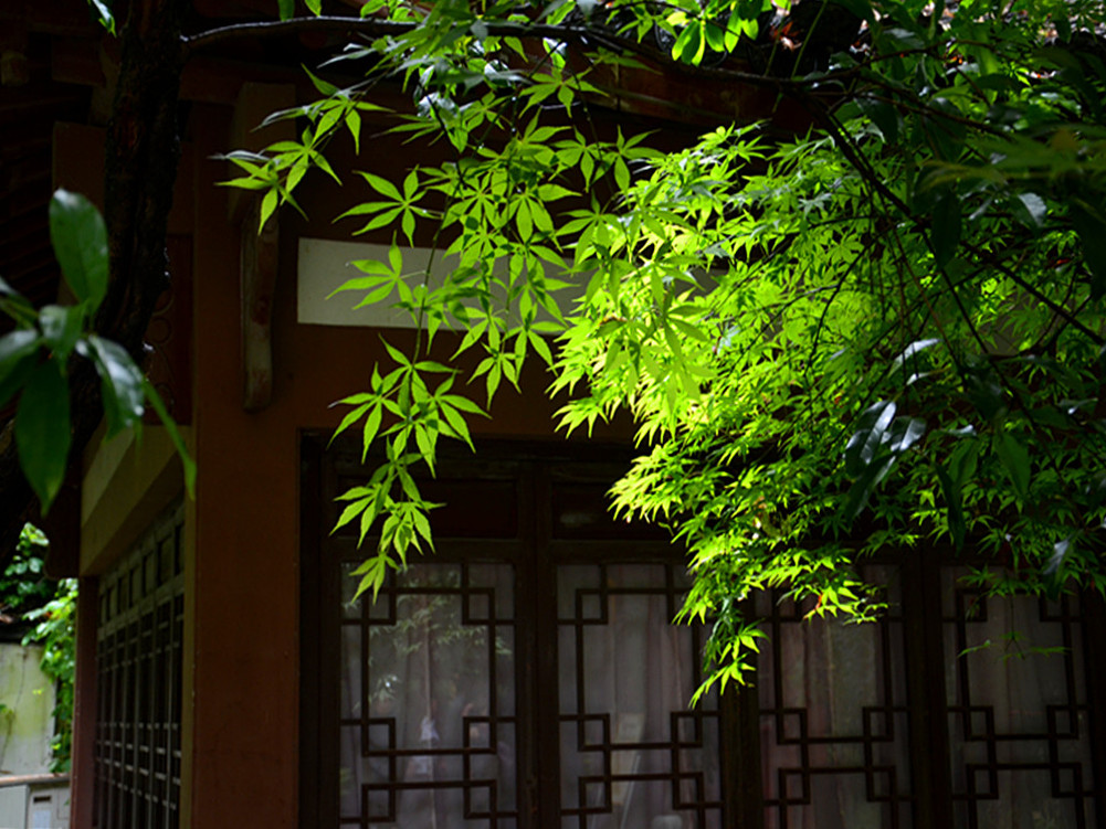 焦山行宫中的芭蕉叶在夏日里显得格外的郁郁葱葱,夏日阳光照射下鲜艳剔透。
