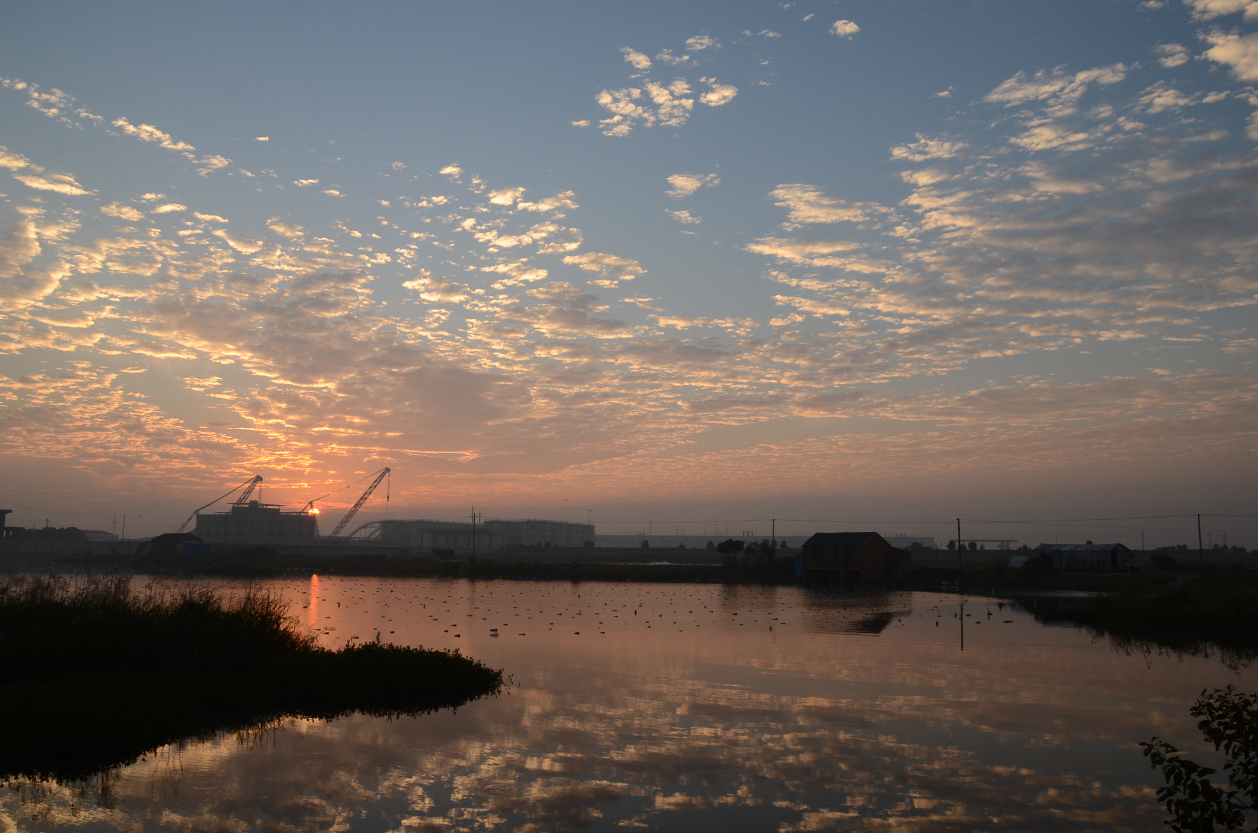 水乡的早晨,朝霞中的金塔大桥工地。