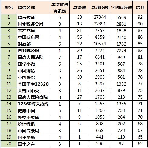 为了更好地了解中央机构的微信帐号运营情况,观察政务微信集群的发展态势,我们通过对中央机构30个微信公众号,随机抽取其本周内某一天的数据,根据阅读数、点赞数等指标,从传播力、活跃度、触达率等维度,做出如下综合影响力排行榜: