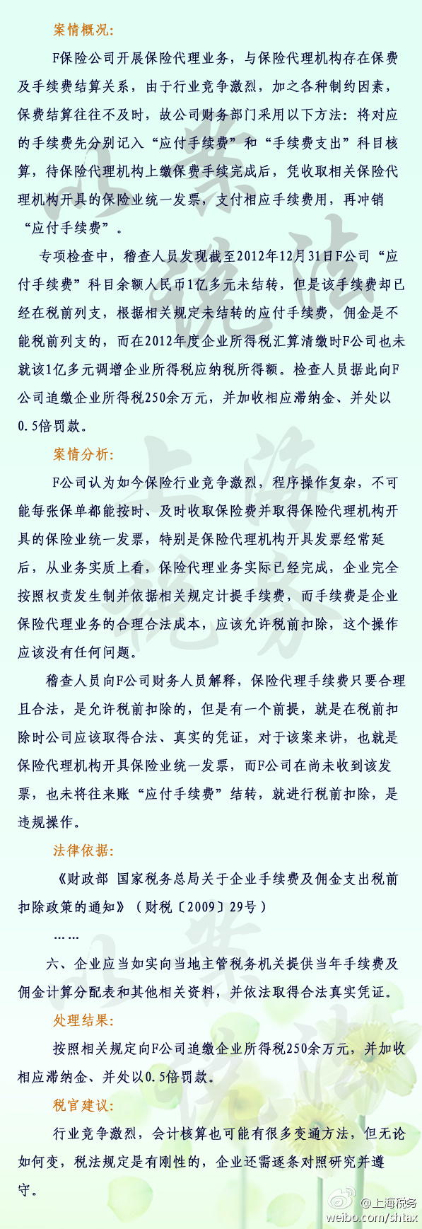 上海税务新浪微博日前发布的一则案例称,F公司开展保险业务,2012年底“应付手续费”余额1亿多元,在未收到保险代理机构开具的统一发票、也未进行结转的情况下,公司在税前列支该手续费,被税务局责成补缴企业所得税250余万元,并加收滞纳金、处0.5倍罚款。