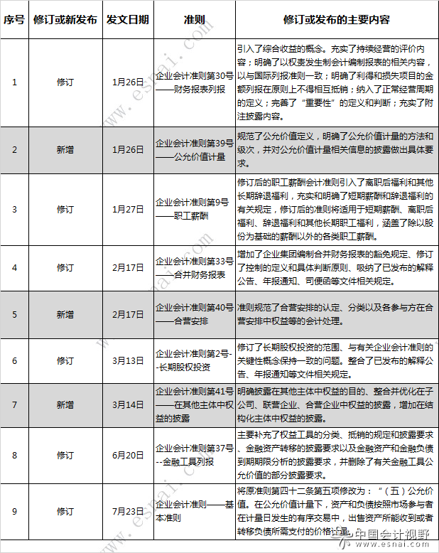 修订6项会计准则:企业会计准则——基本准则、企业会计准则第30号——财务报表列报、企业会计准则第9号——职工薪酬、企业会计准则第33号——合并财务报表、企业会计准则第2号--长期股权投资、企业会计准则第37号--金融工具列报。3项新准则:企业会计准则第39号——公允价值计量、企业会计准则第40号——合营安排、企业会计准则第41号——在其他主体中权益的披露。