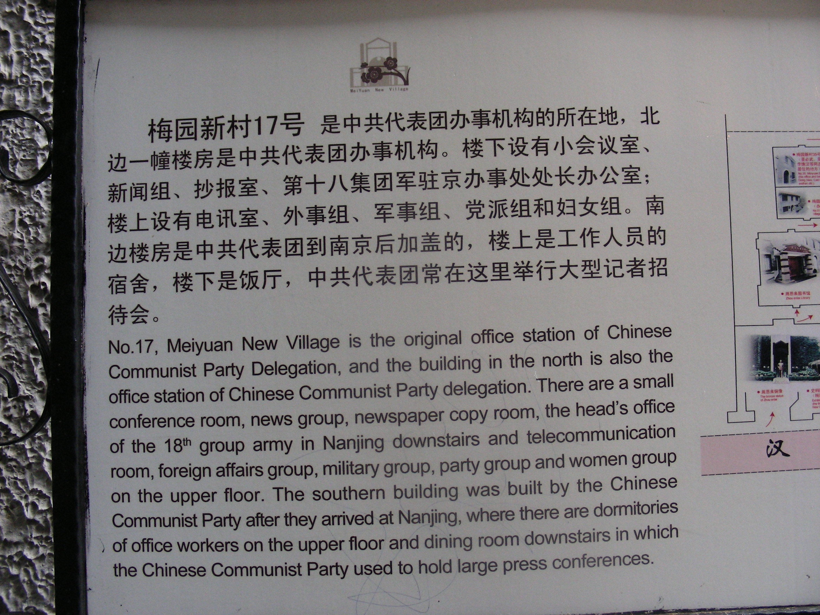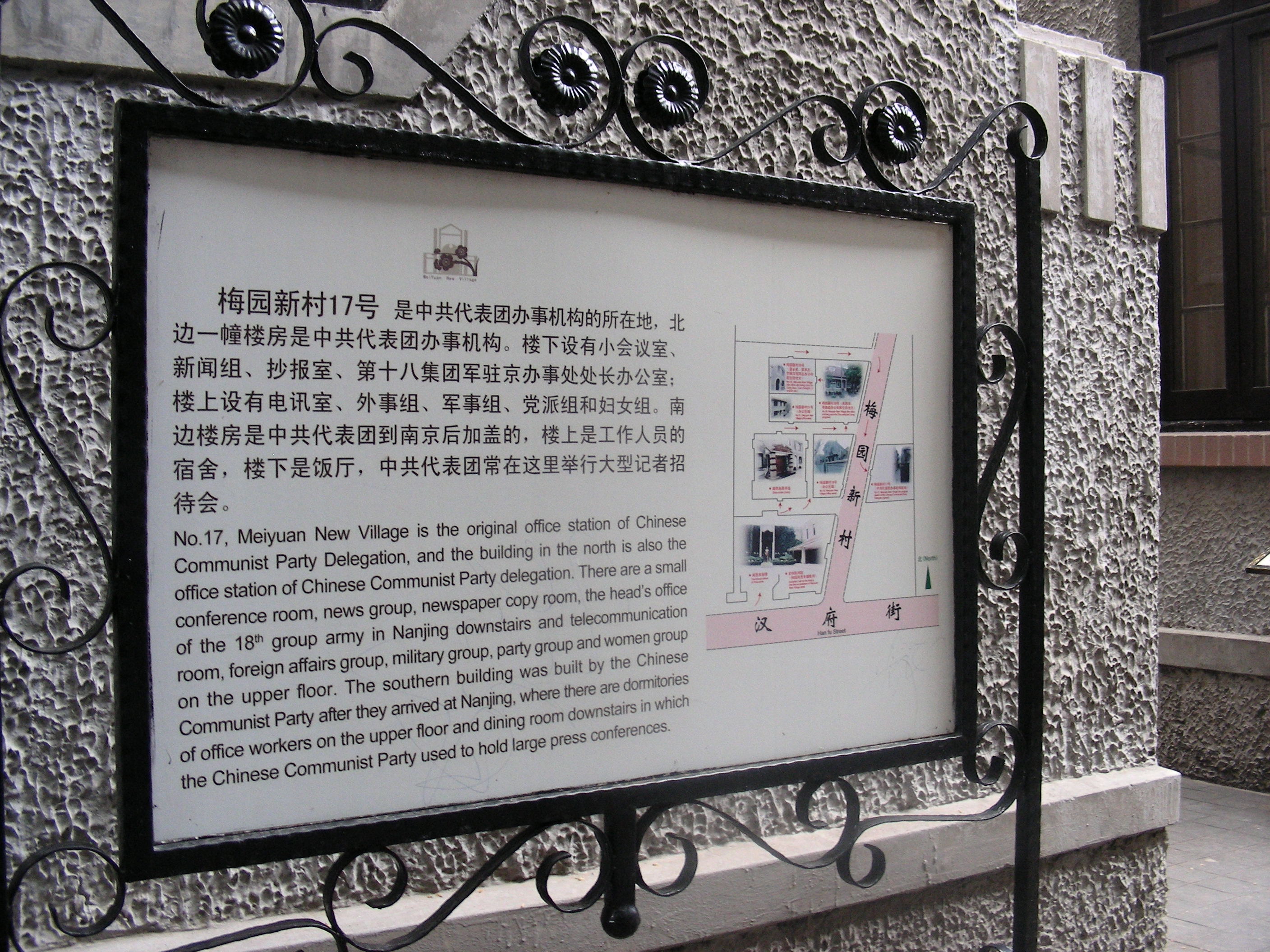 梅园新村街道西侧由南至北依此是史料陈列馆、周恩来图书馆、梅园新村30号,梅园新村35号紧邻30号,位于30号西北角。梅园新村17号位于街道东侧