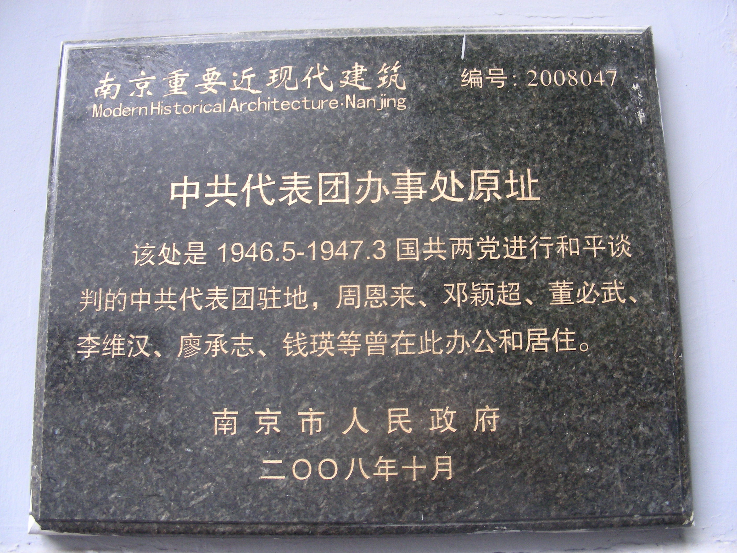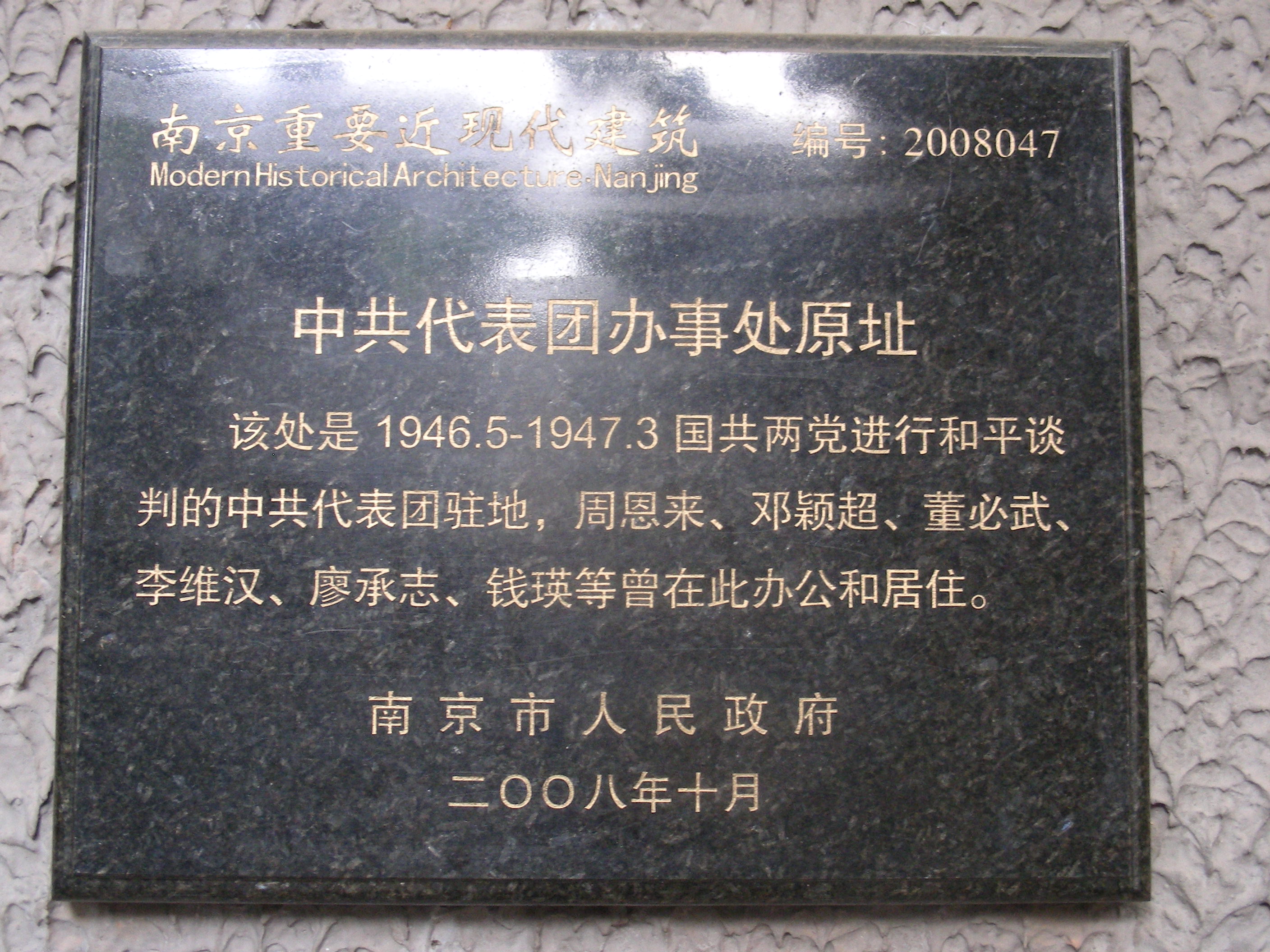 梅园新村纪念馆,位于江苏省南京市城东长江路东端的梅园新村街道两侧,由中共代表团办事处旧址、国共南京谈判史料陈列馆、周恩来铜像、周恩来图书馆等组成,属于近现代历史遗迹及革命纪念建筑物。1946年5月至1947年3月,以周恩来为首的中国共产党代表团,在这里同国民党政府进行了10个月零4天的谈判。