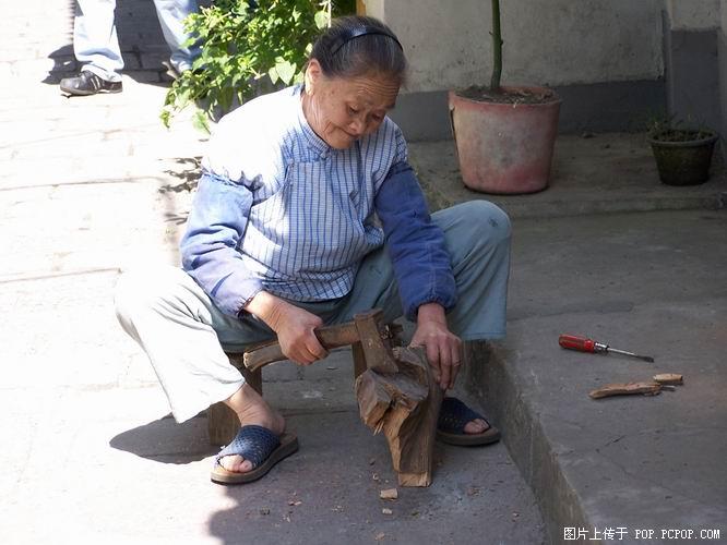 <>23、这个婆婆儿子是开弓箭铺的,年近七旬依然繁碌的作业着。在帮她的儿子选些木头。
