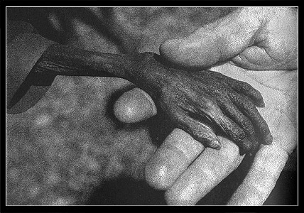 一个乌干达孩子的手放在一只与他对比鲜明的传教士的手中,孩子的手!!